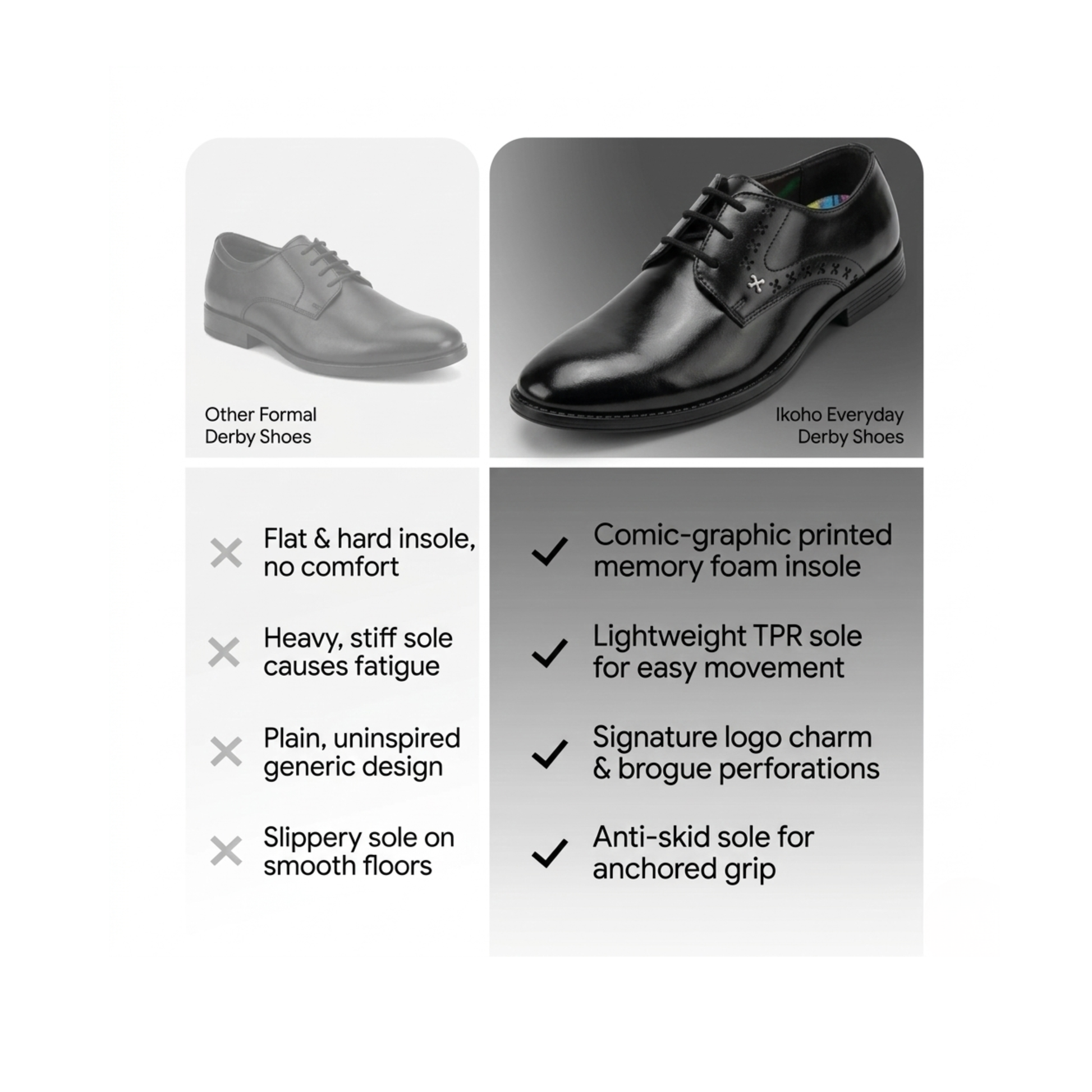 Built for the 9-to-5 and beyond, the Everyday Derby Shoes feature a premium leather upper and lining with a classic lace-up silhouette, finished with the Ikoho logo metal charm and logo-shaped brogue perforation detailing. Inside, the comic graphic printed memory foam insole with the mascot adds comfort and colour, while the lightweight, durable TPR sole keeps you moving all day without blending in.