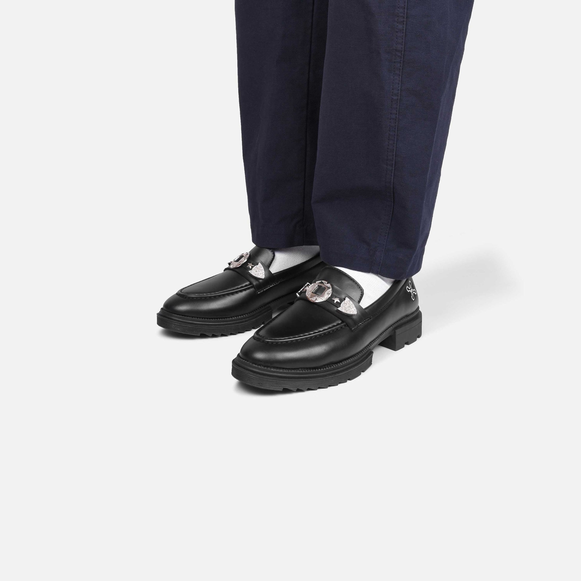 A high-shine black vegan leather loafer with a bold silver star-detailed buckle. Designed with a classic penny strap and finished on a chunky track sole, this pair delivers polished looks with a strong, modern edge. Cushioned for comfort and built to stand out.